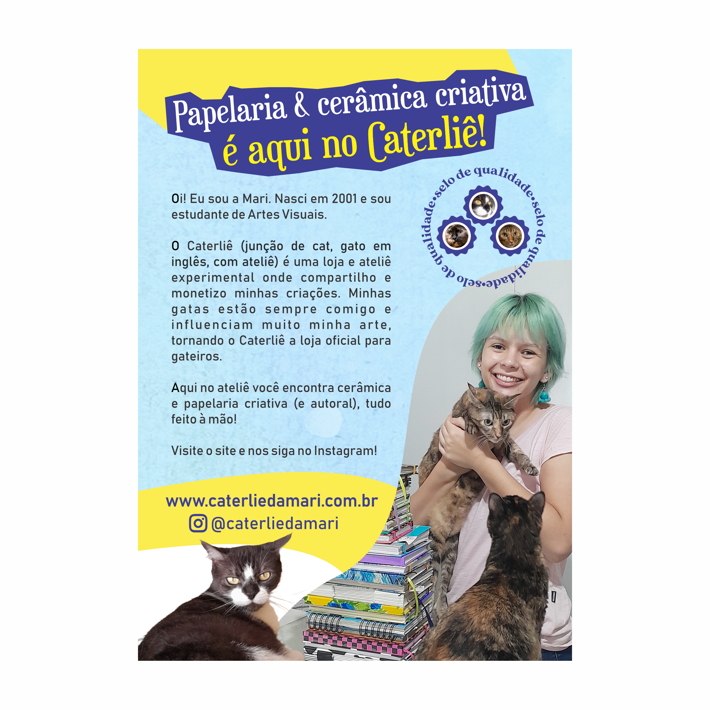O Caterliê (junção de cat, gato em inglês, com ateliê) é uma loja e ateliê experimental onde compartilho e monetizo minhas criações. Minhas gatas estão sempre comigo e influenciam muito minha arte, tornando o Caterliê a loja oficial para gateiros (desde 2018 <3).